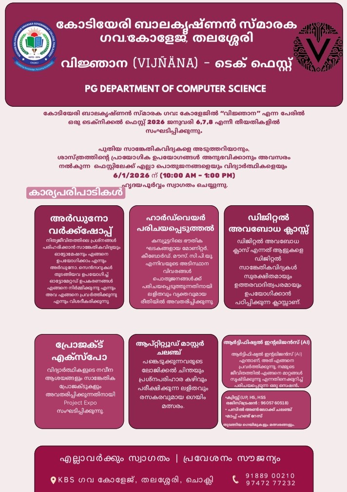 Dive into the future of technology at Vijnana 2024, where innovation meets excitement! Join us for an electrifying experience curated by the visionary PG Department of Computer Science at KBMGCT. More details at : Vijnana2024.web.app Pre Events