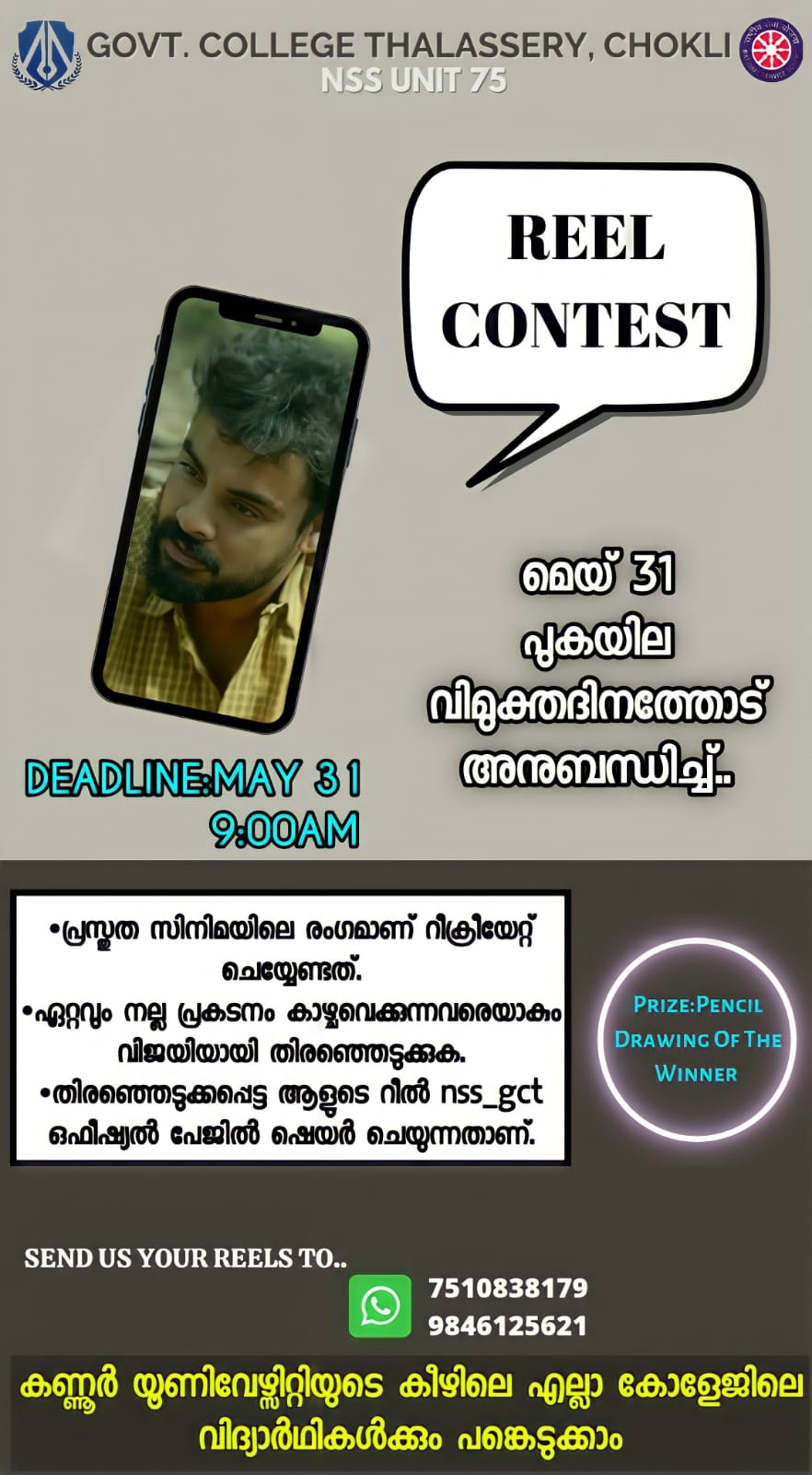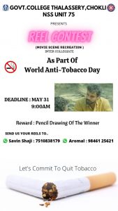 Govt. College Thalassery NSS Unit conducts a “Reel Contest” as part of World Anti-Tobacco Day For more deatils about the contest check out the Instagram page of NSS GCT. Click Here