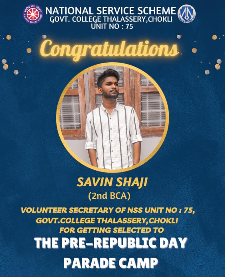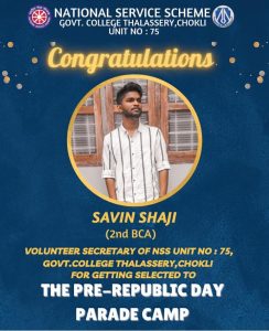 Congratulations to Savin Shaji of Second Year BCA for getting selected to The Pre-Republic Day Parade Camp. Savin Shaji of Second Year BCA has been selected for the Pre-Republic Day Parade Camp with first rank under Kannur University.