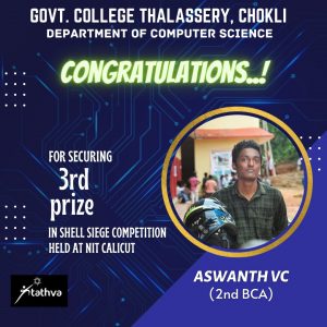Congratulations!! Aswanth V C of 2nd year BCA has won 3rd prize in Shell Scripting competition held at NIT Calicut. Congratulations!! Aswanth V C of 2nd year BCA has won 3rd prize in Shell Scripting competition held at NIT Calicut.