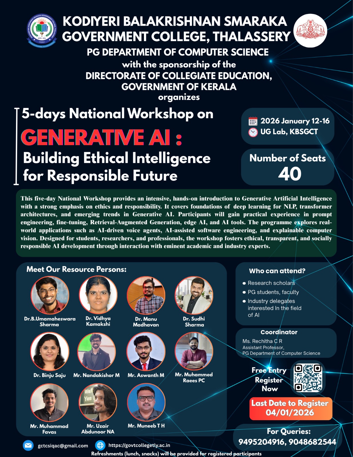 KBS Govt College, Thalassery is situated in a rural area of Kannur District. Through this workshop we envision to create an opportunity for the students and researchers of this geographical area to interact with researchers and eminent faculties across the country. This workshop aims to empower participants to create and apply Generative AI responsibly, ensuring ethical, transparent, and socially beneficial outcomes